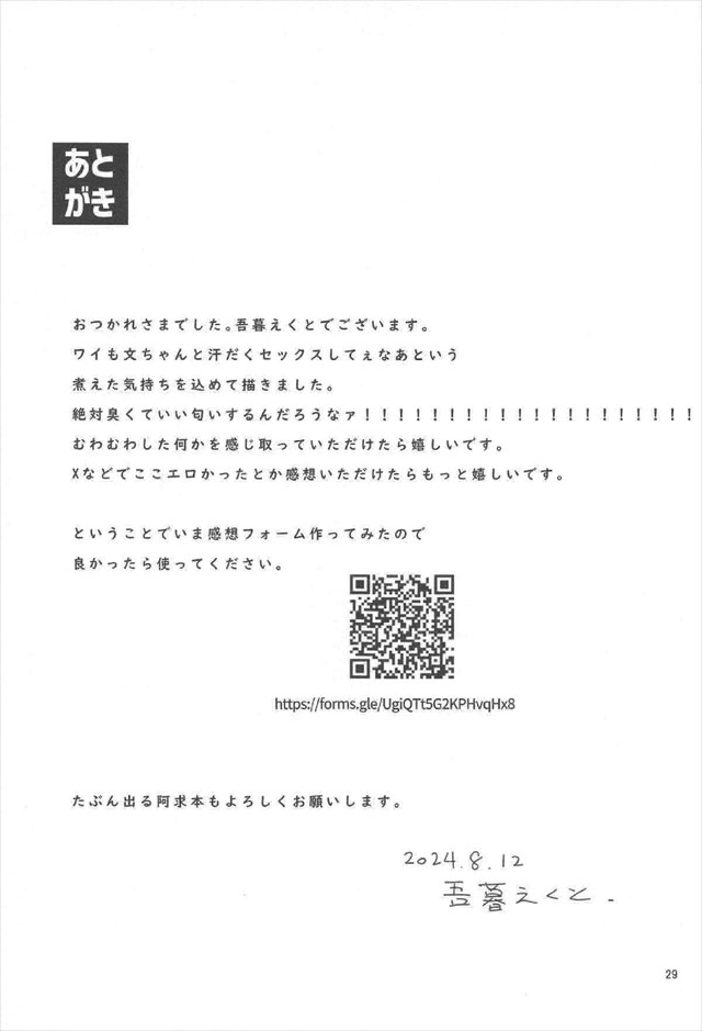 《東方》やっぱり女は「この人の子供が欲しい!」という相手のチンポだと感度も上がるんでしょうね。文が好きな人のチンポでイキまくりです! エロ同人誌 エロ漫画 同人響 東方Project イチャラブ 巨乳 断面図 イチャラブ 巨乳 断面図 が含まれる記事です。《東方》やっぱり女は「この人の子供が欲しい!」という相手のチンポだと感度も上がるんでしょうね。文が好きな人のチンポでイキまくりです! エロ同人誌 エロ漫画 同人響 東方Project イチャラブ 巨乳 断面図 関連同人 Myリストに追加! 《エロ漫画 艦隊これくしょん》ろーちゃんは常に発情期ですって!ネコの耳としっぽが生えたろーちゃんは身も心も発情ネコなのだよ! エロ同人誌エロ漫画同人響艦隊これくしょん-艦これ- その2 Myリストに追加! 《グリザイアの果実 エロ同人誌》みちるが勉強できないのは授業中に悶々とエロ妄想をするからで、妄想が現実になった今、勉強できるように…ならないですねw エロ同人誌エロ漫画グリザイアの果実同人響 Myリストに追加! 《IS エロ同人誌》女の園でこれだけラッキースケベをお見舞いされてもハーレムを維持出来たのは…千冬姉が抜いてたからか!大人の魅力で小娘程度じゃチンピク無しw インフィニット・ストラトスエロ同人誌エロ漫画同人響 Myリストに追加! 《アズレン》途中で目覚める系の睡眠姦ではなくて最後まで一瞬たりとも目覚めない睡眠姦です!というわけでバッチをグッスリ眠らせてやったぜー! アズールレーンエロ同人誌エロ漫画同人響 Myリストに追加! 《FGO》精子をいっぱい出さないと死にます。ナイチンゲールにそう宣告されたマスターさん。じゃあいっぱい出さないとね!そんな婦長がマスターとやりたいだけなお話!w Fate/Grand Order(グランドオーダー)エロ同人誌エロ漫画同人響 Myリストに追加! 《ブルアカ》ヒフミがあうあうしてます。だって目の前で先生が射精しちゃうんだもん!シャーレの執務室でオナニーをする先生が一番悪いので、ヒフミはあうあうしなくて良し! エロ同人誌エロ漫画ブルーアーカイブ同人響 Myリストに追加! 《デレマス エロ漫画》紐パンでガーターベルトな幸子が発情しきったトロ顔で「この紐をほどいて下さい…。」かわいい!カワイイよ幸子!www アイドルマスター シンデレラガールズエロ同人誌エロ漫画同人響 Myリストに追加! 《エロ漫画 ローゼンメイデン》水銀燈A「あんた誰!?」⇒水銀燈B「あんたこそ誰よ!?」 一方は平行世界のお姉様よ!と雪華綺晶の説明が入ったら百合3P開始w エロ同人誌エロ漫画ローゼンメイデン同人響 関連ビデオをさらに表示 コメントを残す コメントをキャンセルメールアドレスが公開されることはありません。 ※ が付いている欄は必須項目ですCommentName * Email * Website 次回のコメントで使用するためブラウザーに自分の名前、メールアドレス、サイトを保存する。 Δ